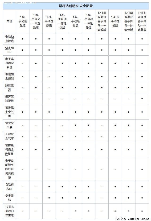 【配置方面】根据不同车型,全新明锐配备有双温区自动空调、可加热外后视镜、后排中央扶手和空调出风口以及支持多种影音娱乐接口。同时,全新明锐标配了ABS+EBD以及前排双安全气囊,而除了入门级车型之外,该车还配备车身电子稳定控制系统、坡道辅助、胎压监测以及倒车雷达等功能。高配车型则配备有侧安全气囊、头部气帘等配置。