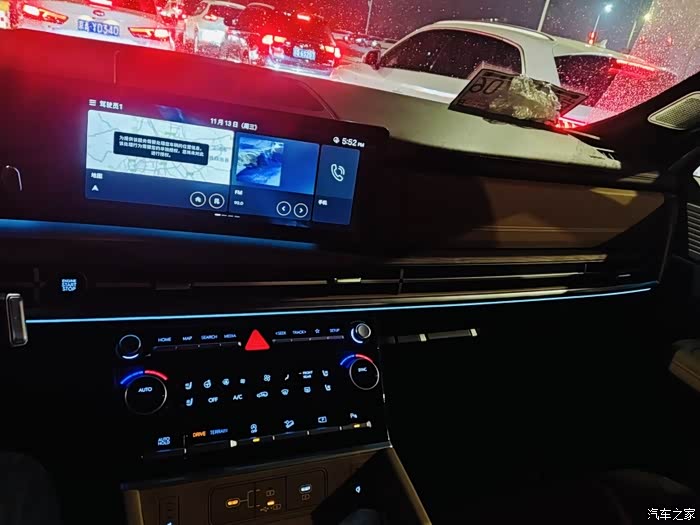 然后就是车开起来后,他的HUD清晰的把你的返程路情况投射到你的挡风玻璃上,不仅看着高级,确实还是很实用的。回家途中如果你想调整个歌曲,换一下内饰氛围灯或者调整一下空调内外循环等,除了最常规的语音控制这种外,五代胜达最引以为傲的就是中控保留了大量的实体按键,这在新能源当道的时代显得弥足珍贵,轻松让你便捷又安全的盲操。