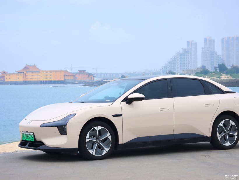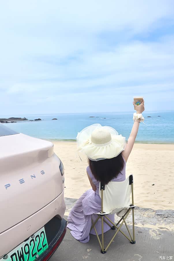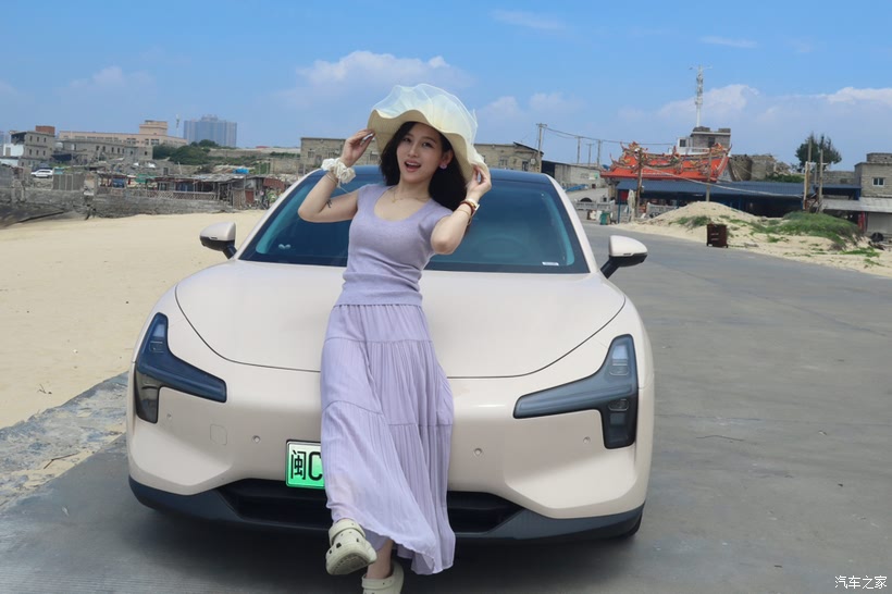石狮黄金海岸的沙粒,在烈日下灼灼闪烁,如亿万碎金铺向海天交接处。远处的洛迦寺更是为其增添光彩。就在这片耀眼的金色与深蓝之间,小鹏M03静静停驻。