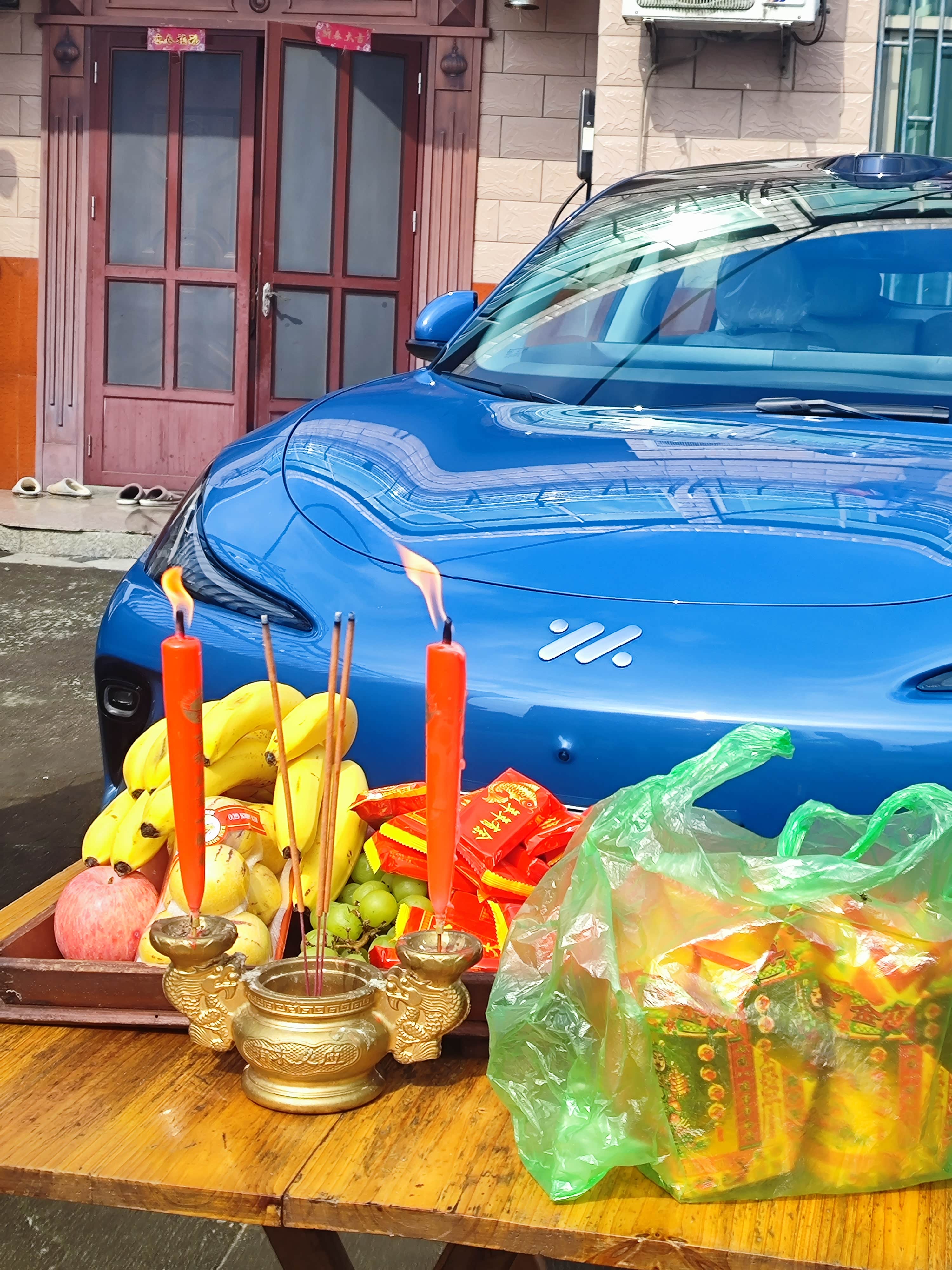 一路上看着窗外的风景从城市楼宇渐渐换成乡野风光,归乡的心情也越来越迫切,开了一上午,终于到了老家,浙江的年味儿里,总少不了老祖宗传下来的仪式感——请车头菩萨。在自家院子里,在我的蓝色智己LS6前摆上满满当当的贡品:金黄的香蕉、红彤彤的苹果、青翠的葡萄,还有寓意吉祥的糖果。点上红烛和香火,袅袅青烟升起,对着车头虔诚祭拜,祈求新的一年里,出行平安顺遂,车轮滚滚,一路坦途。
