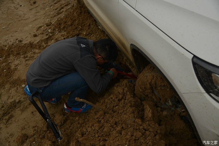 计划用千斤顶把车身顶起来,然后往轮胎下面垫石子,结果土太松了,撑不住