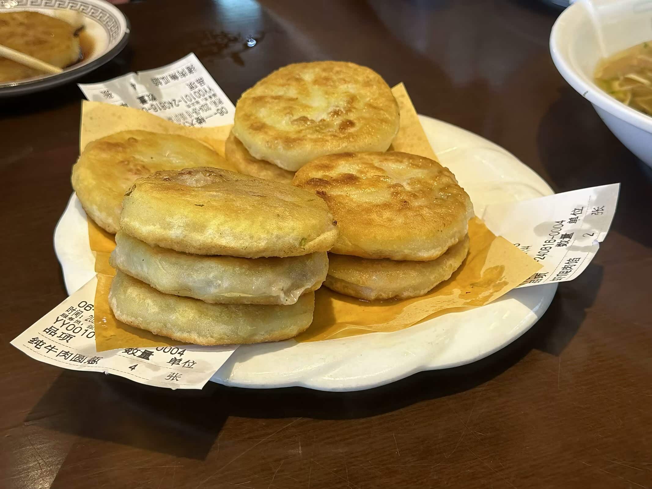 馅饼的介绍选料,这是店里招牌上写的,我给复述一下,坚持选用当天宰杀的新鲜前槽猪肉或优质牛肉,肥瘦比例精准,搭配应季时蔬。面粉则选用优质小麦粉,用冷水和面,保证面团的韧性。手工剁馅保留肉粒口感,拌馅时加入秘制老汤提鲜,再配以葱姜蒜等调料,顺着一个方向搅打上劲,使馅料抱团多汁,鲜香浓郁。
