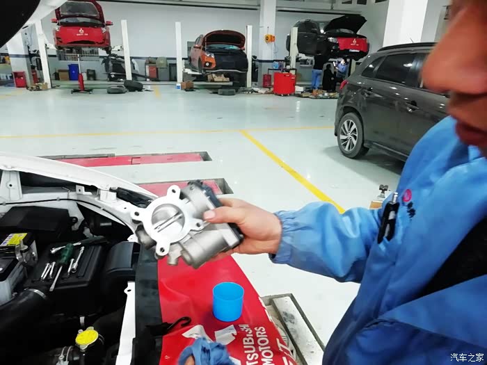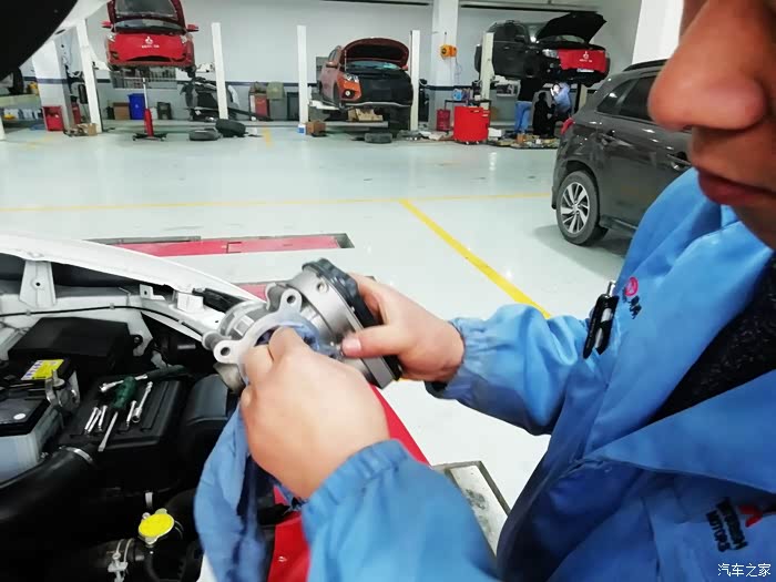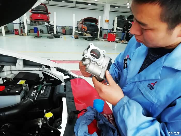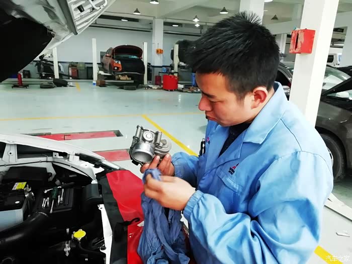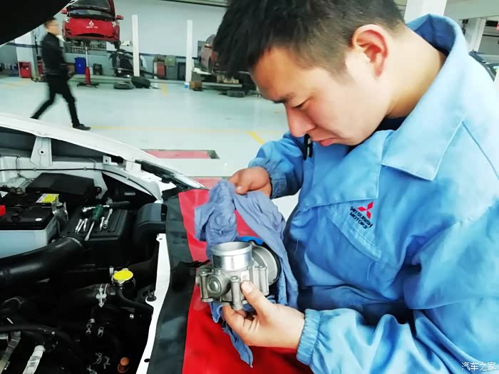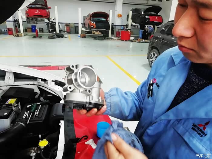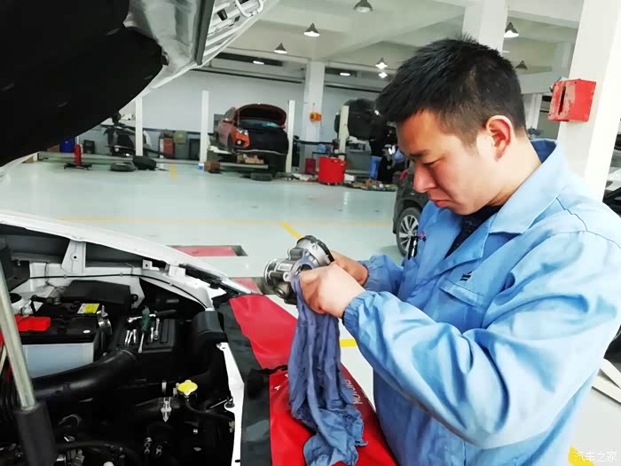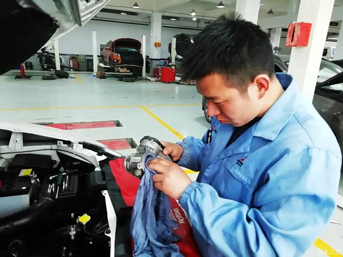 直接用棉布擦拭节气门内部,师傅说节气门中间的翻板尽量不要用手去触动,因为翻板本身比较脆弱,也是一个高精度配件,手动很容易影响它的开度,从而影响车辆状况。若真的很脏不得不用手掰动清洗,一定要轻、要小心。