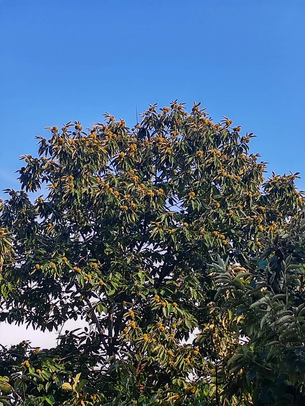 这时候我们还在担心,山上的板栗会不会都没熟,结果没走多久,就看到一颗巨大的板栗树,一树的板栗都是棕色,地上也掉落很多,全都已经成熟了。