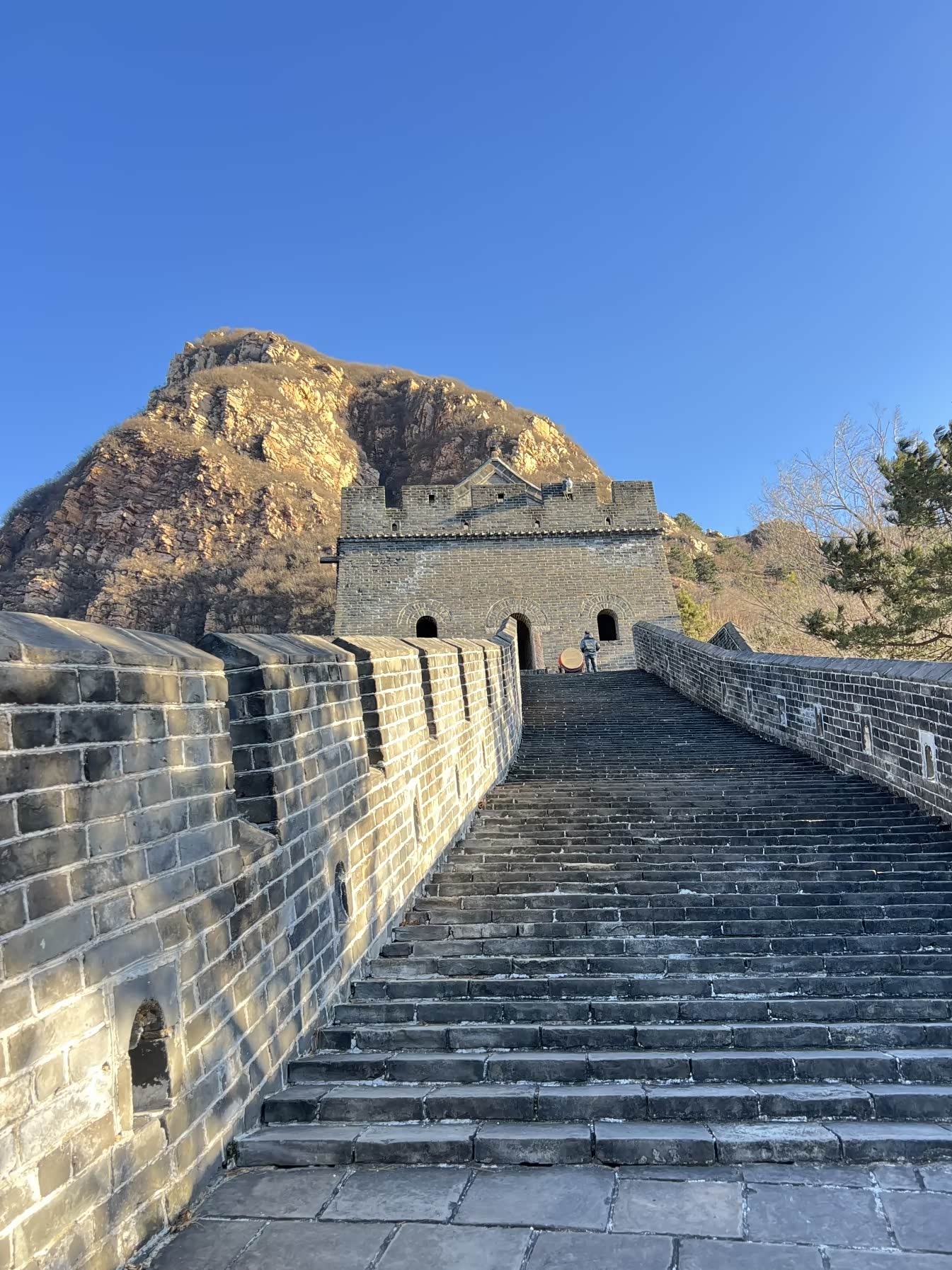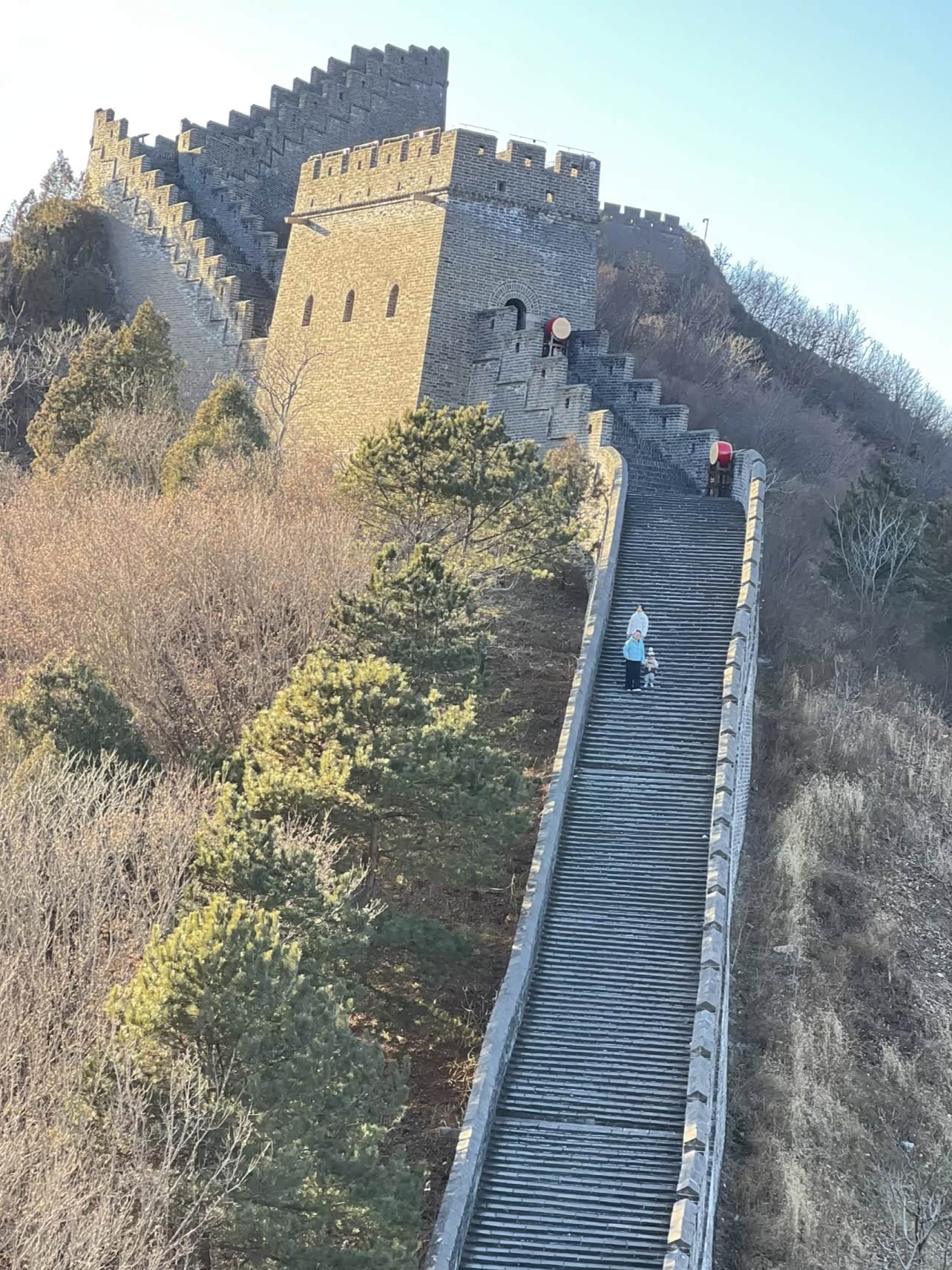 冬日的黄崖关少了往日的熙攘,多了份清冽与壮阔。阳光洒在斑驳的城砖上,给蜿蜒的长城镀上了一层温柔的金光。小朋友兴奋极了,一步一个脚印往上爬,偶尔会被城墙上凹凸的纹路吸引,停下来仰着小脸问:“妈妈,这是古代士兵留下的痕迹吗?”