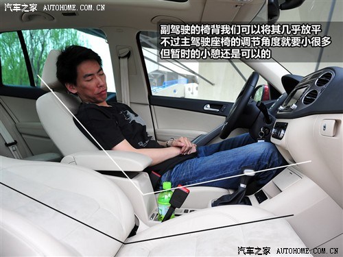 途观前排两个座椅的椅背角度可调范围并不相同。副驾驶座椅椅背几乎可以完全放倒,而主驾驶的椅背只能放倒大约120°,不过这样也已经足够舒适了,用来让长途驾驶的驾驶者中途小憩是没有问题的。