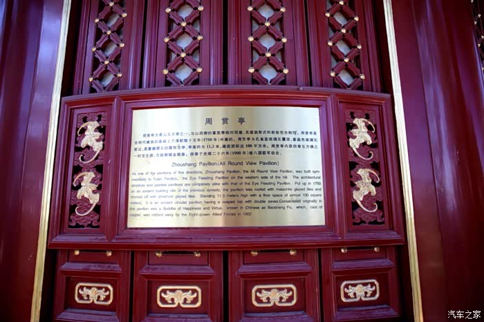 周赏亭 东侧第一座亭。孔雀蓝琉璃筒瓦顶,紫晶色琉璃瓦剪边,重檐圆攒尖顶。上檐重昂七踩斗栱,下檐单昂五踩斗栱,两槽柱子,内外各有八根。亭高约为11.3米,建筑面积近100平方米。内原供五方佛之一的宝生佛(Ratnasambhava Buddha),为铸铜镏金佛像,被八国联军劫去。