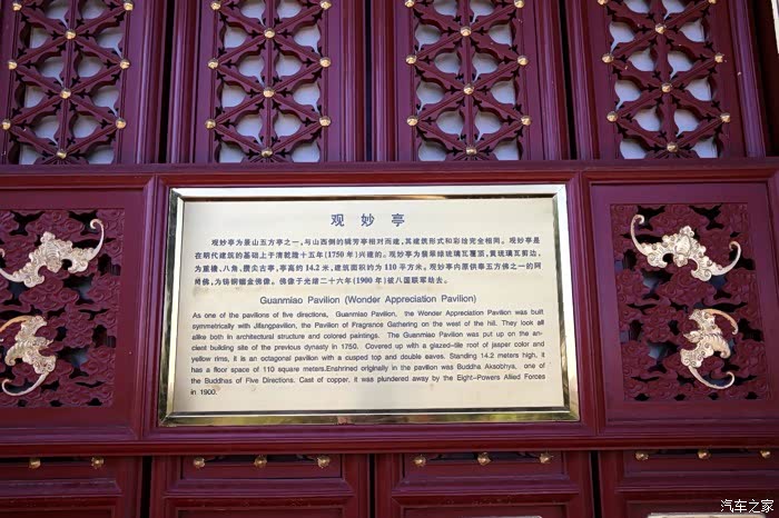 观妙亭 东侧第二座亭。翡翠绿琉璃筒瓦顶,黄琉璃筒瓦剪边,重檐八角攒尖式。上檐重昂七踩斗栱,下檐单昂五踩斗栱,两槽柱子,内外各有八根。亭高约为14.2米,建筑面积约为110平方米。内原供五方佛之一的阿閦佛(Aksobhya Buddha),为铸铜镏金佛像,被八国联军劫去。