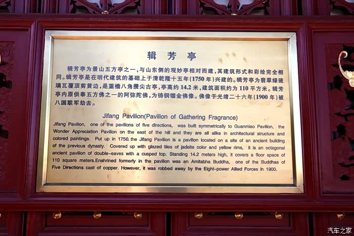 亭高约为14.2米,建筑面积约为110平方米。内原供五方佛之一的阿弥陀佛(Amita Buddha),为铸铜镏金佛像,被八国联军劫去。