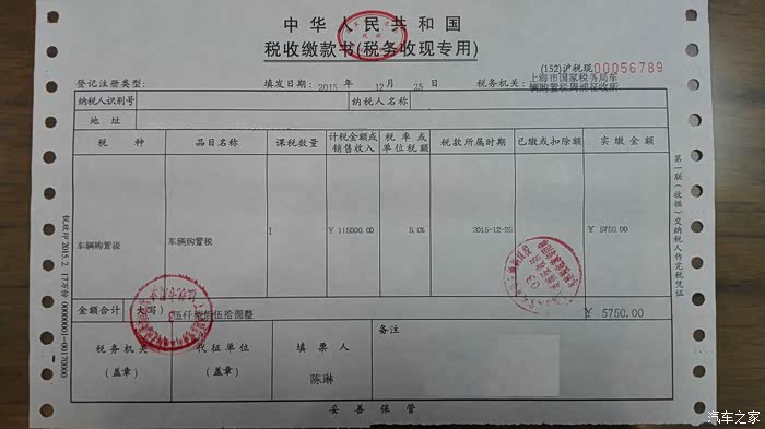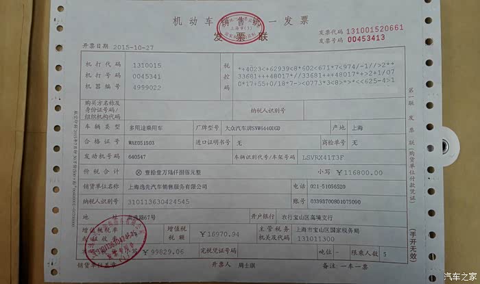 2015年10月27日开票,光车价116800,保险车损+三者50万+不计免赔+交强+税预付5000多退少补,其余杂费1000,临牌50。