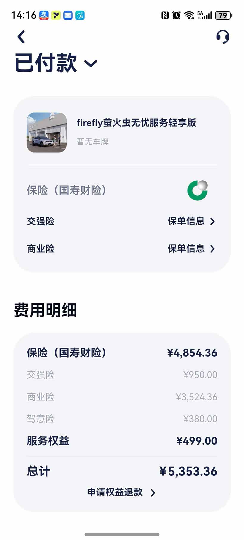 总结下购车费用:车款(电池租赁)89999(含3000色外观和颜色3000的内饰颜色选装);车险4554.36(跟这个车价比确实太贵了,毕竟电池租用的,电池的保险是蔚来负责),还选了个服务无忧499,共计95052.36元,减去13000的置换补贴,实际花费82052.36元。