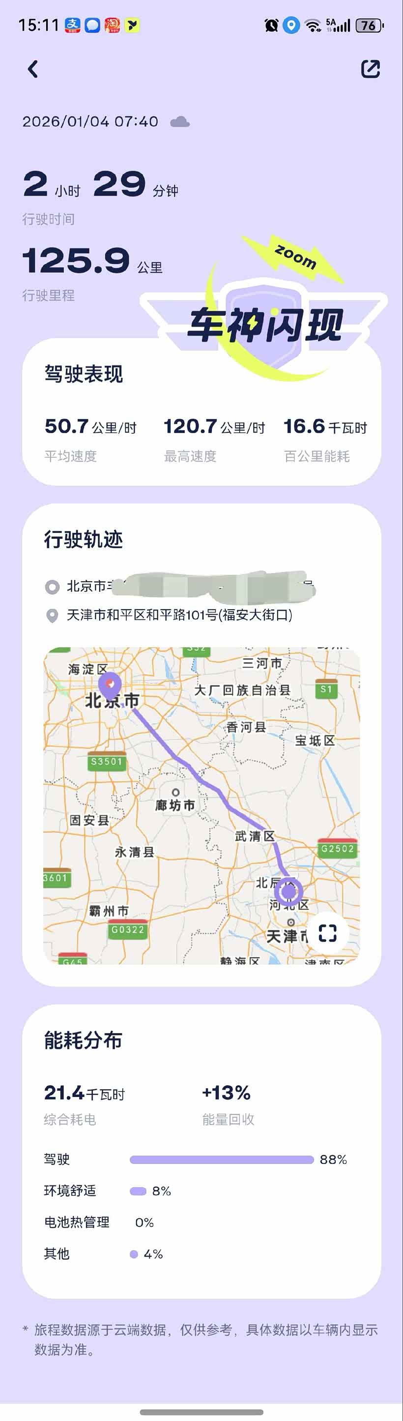 3. 作为汽车爱好者,看看小车长途高速的行驶和补能情况;