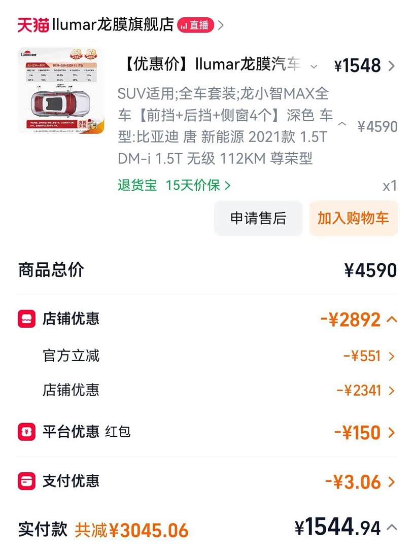 贴膜用的龙膜,因为自己的油车上也在用,效果不错。供参考。