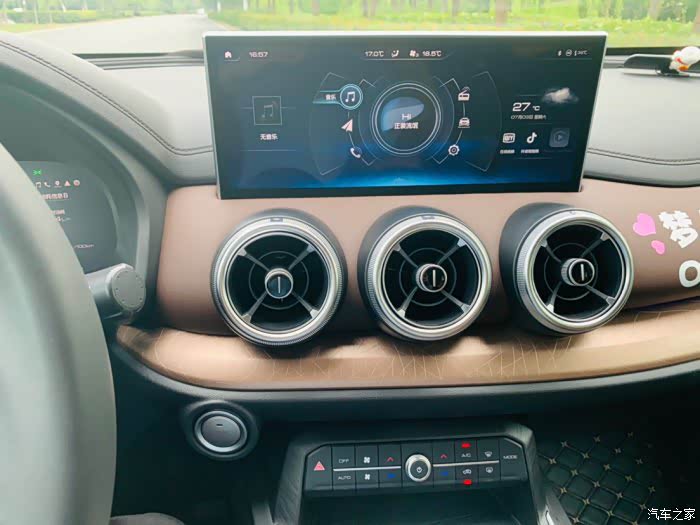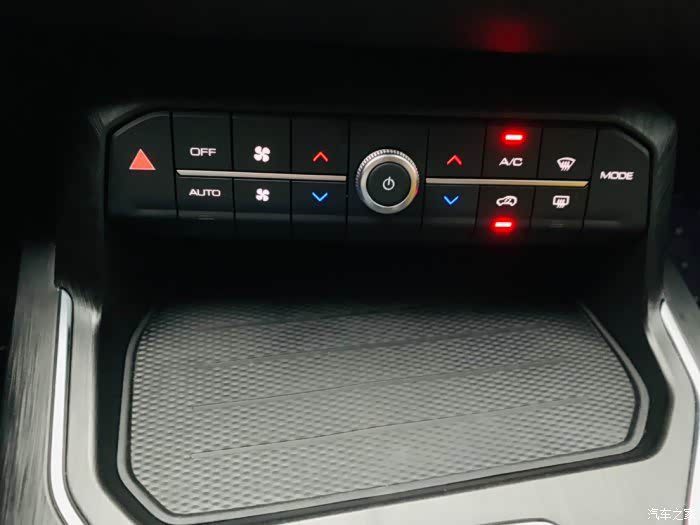 中控屏的下面是按钮式的空调调节按钮,对于喜欢实体按钮的人来说,是个不错的设计,可以供主驾副驾调节空调温度,风向