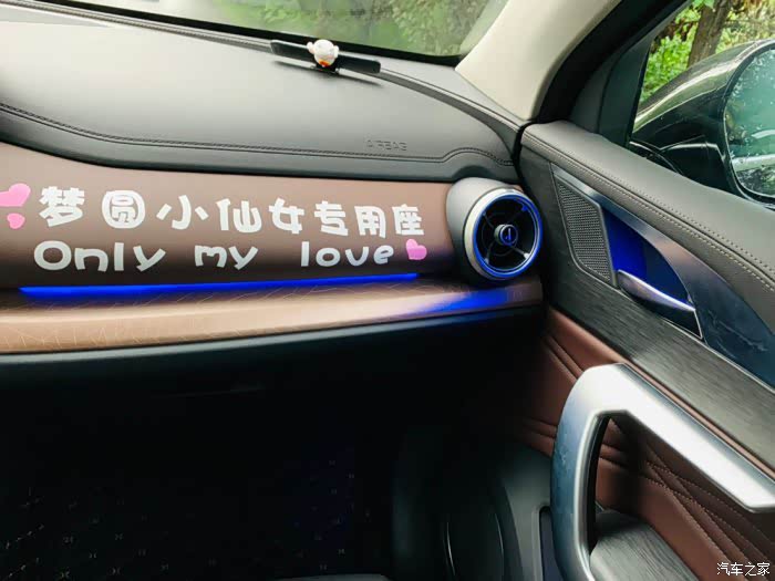 其次,来到了副驾的视觉,蓝色的氛围灯,彰显着车的高级感,晚上打开很有情调