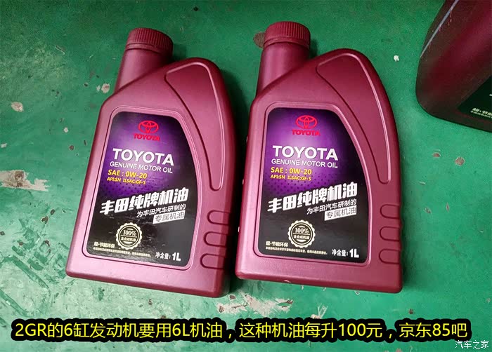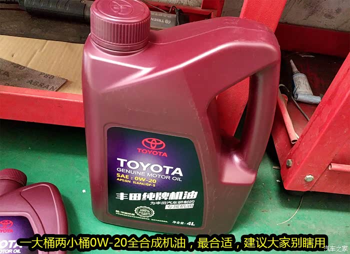 保养用的机油是纯牌全合成0W-20,这个机油比较稀,汉兰达涡轮和自吸机头都适合,不超过10万公里,其实没必要用稠的机油,保养手册上建议不要使用30以上的。这款机油京东自营标价是90元/1L,5.5L的价格是460元,其实没有比4S便宜几个钱,优势不大。涡轮机头一般使用4.6L左右,尽管保养手册上注明是可以加注4.9L,但是这个标注是在使用换油机的情况下,旧机油抽得很干净,才能加到这个数。人工换油,一般只能加4.6L,3.5自吸机头则需要加5.5L。加完之后热机一两分钟,让机油流到机器内部,然后检查机油尺,不要超过上面的刻度。咨询了老师傅说略超过一点也没问题,多了不行,会出现油门沉、发动机声音大、油耗增大等现象。