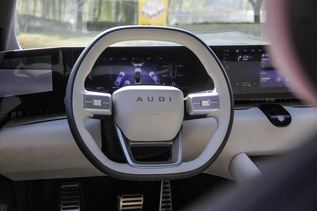 奥迪E5 Sportback的方向盘,为三幅式多边形设计,造型简约干练,同时还保留了实体按键,操作方便。?