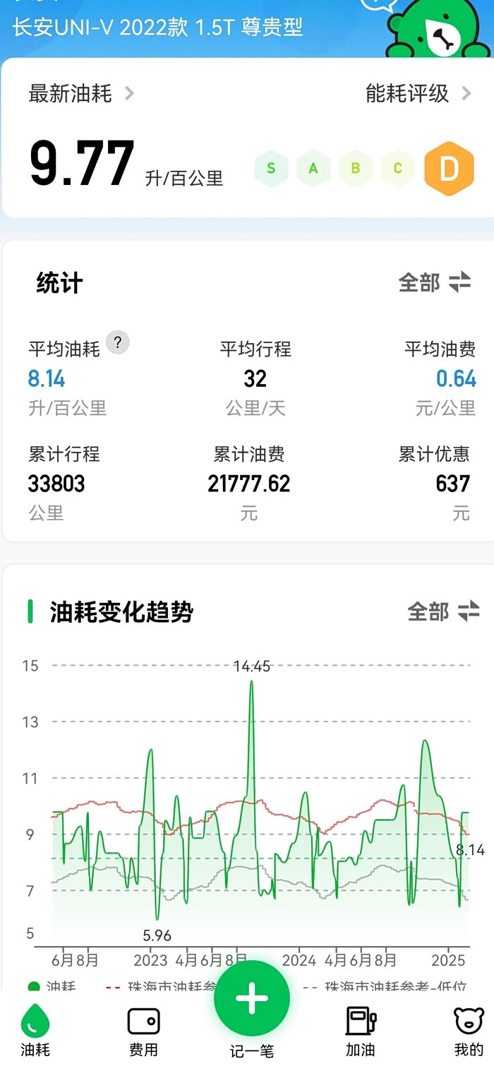 我这台长安UNI-V陪伴我跑了整整33803公里,加油账单在小熊油耗上记了三年,总油费21777元,算下来每公里6毛4,综合油耗8.14L/百公里。当初买车时销售说这车油耗7L起,现在看仪表盘显示的长期油耗7.2L确实有点“快乐表”嫌疑,实际算下来比表显多1L左右,建议大家自己记账更靠谱。