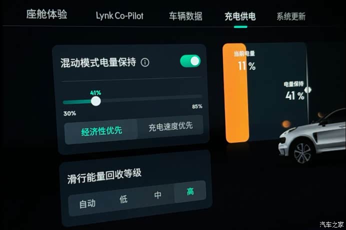 如果是家里没有充电桩的情况,我建议还是用智能混动的模式,电量保持放在30%左右,选择经济性优先,动能回收调到最高,这样不管怎么狠踩油耗基本都是不会过6L。跑长途还可以把电量保持的百分比调高一点,比如60%以上,高速下其实发动机直驱的效率是比电机高的,这也是发动机比较省油的工况,巡航状态下没有必要多用电,到了目的地进了市区,这就到了电机的优势工况,电池还能有足够电量支持纯电或者混动行驶,也算是比较省油的一种开法。