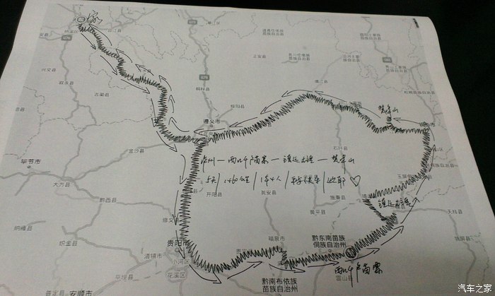 之前做的路书以及打印的地图,到了遵义后先往地图的下方走,然后就是画了一个小圈圈再次回到遵义。每次出游都喜欢打印一份这样当日行程的地图,简单明了,如果临时要更改线路,也是一目了然。
