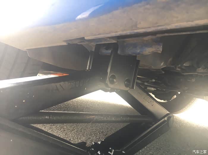 将千斤顶上端卡槽卡在车辆凸出的受力铁板部位