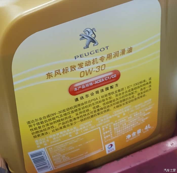 机油图片,每次保养都用这一桶原厂机油,370元左右,还有其他的机油,但是我还是选择原厂这个全合成的机油,到目前为止,我发动机除了烧机油,其他一点毛病没有,我也听过其他车主反映过发动机问题,说什么异响和怠速问题,可我都没遇到过,难道我买的是假标致?说笑啦,只能说一定要按照保养手册操作。