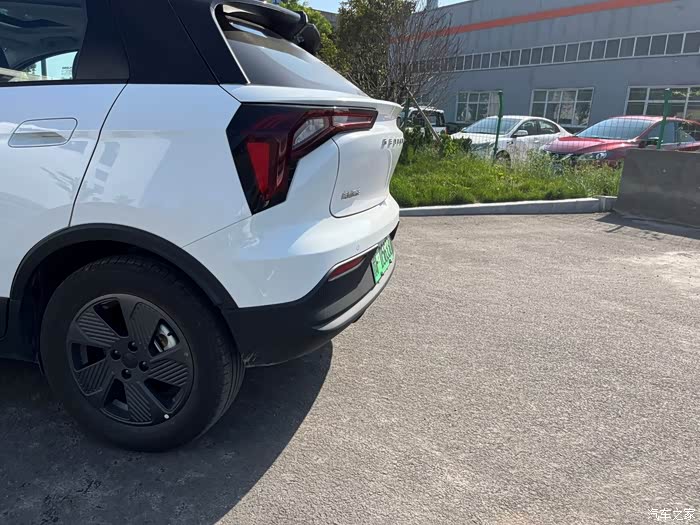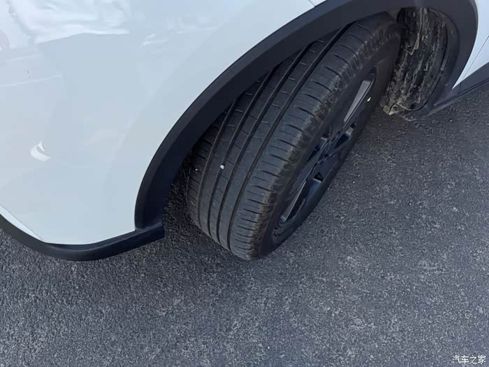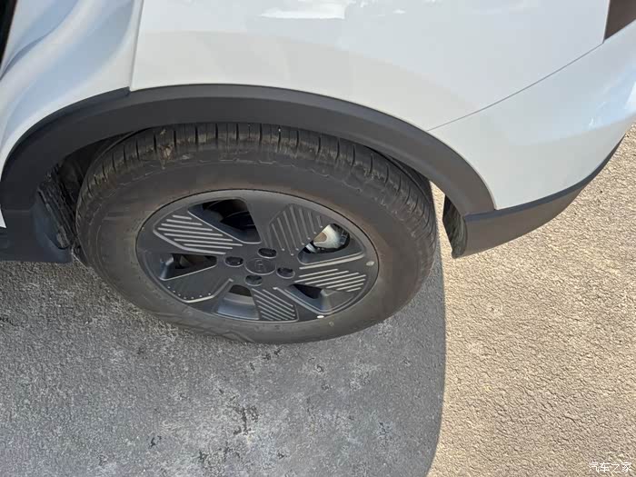 纯黑的轮毂感觉也比较有个性,搭配上纯白的车身,确实挺酷的。