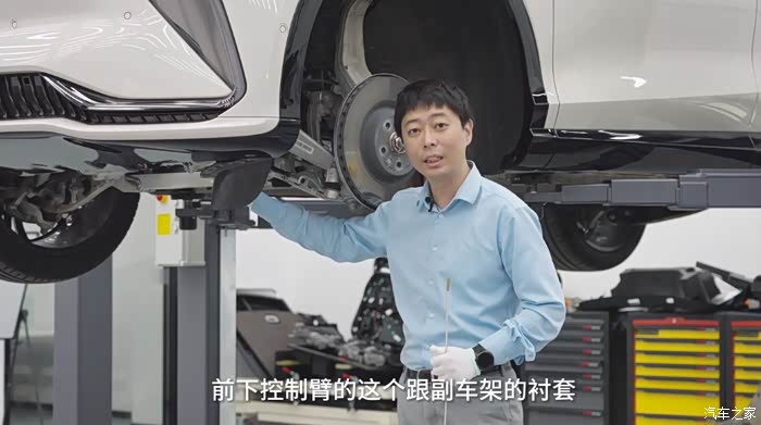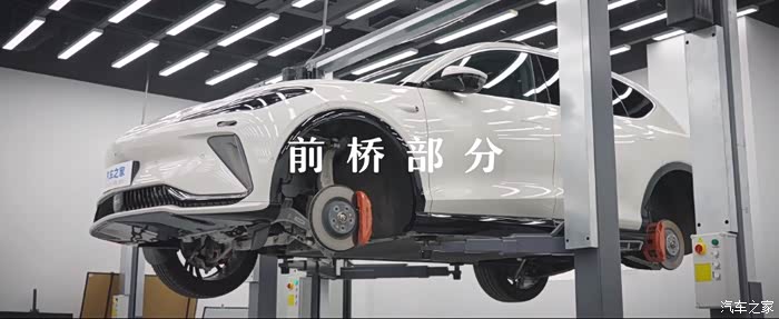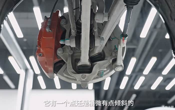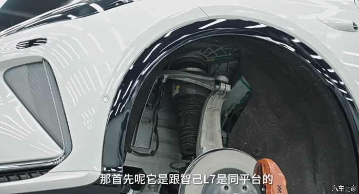 ls7也是采用了跟L7相同的平台,各方面的用料材质今天根据原创视频来揭秘一下,前桥部分采用了铝合金的全框式的副车架,悬架采用前双叉臂悬架,上控制臂,两个下控制臂,轴承座全部都是铝合金,这也是标配,前下控制臂的跟副车架的衬套还是用的液压衬套来改善他的舒服些和振动过滤性。中间也是有一根很粗的防倾杆,主要考虑到他的定位着重运动操作性还有他的自重比较沉,重心也比较高。刹车方面也是一个盘径比较大的内通风盘配上固定式的四活塞的brembo的一体化卡钳,前面减震支柱里面也是配上了来自倍适登的cdc可调软硬的减震器,以及集成了德国大陆的空气弹簧,兼顾舒适性和操作性。