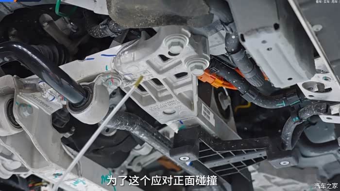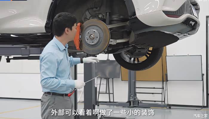 后悬架采用了五连杆式,除了用于承重的下控制臂之外其余四根都是用的铝合金材质,后刹车盘盘径也是很大,集成了一个单活塞的浮动式卡钳,后防倾杆由于轴荷关系没有前部来的粗壮,下控制臂底部还有一个树脂的护板,主要也是为了优化空气动力学尽可能保证彻底平整。后副车架也是采用铝合金,后电机表明也是有一个NVH的包覆。中间电池部分外框架也是采用了铝型材焊接的一个外框架,兼顾刚性,电池底部也是有一个防石击的涂层。总的来说底盘用料绝对是尽善尽美的状态,能用好的不用一般的,也是在这个价位能比较打的存在了。
