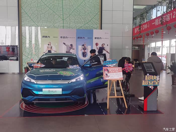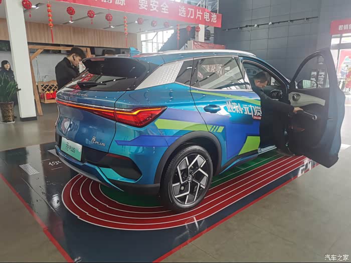 比亚迪元plus 的定位是一款a级suv,很之前的元pro和元看起来并不是特别像,那两款都比较小。元plus的车长接近4.5m,轴距也是有2.72m,是一台纯电的a级suv。最近这些年,新能源汽车是一个趋势,而我也一直想购置一台可以把家人们全部载上的suv,所以今天探店的主要目标就是它。非常幸运,一进店就看到了元plus。它整体的线条和色彩在我看来都充满着时尚的运动气息。元plus延续了比亚迪Dragon face的设计语言,龙须依旧是一个贯穿型的设计。日行灯和大灯上的三条杠是一个亮点,D柱上和座椅靠背上的龙鳞元素也很不错。从侧面看,流线的光影十分灵动,宛若游龙。后灯的形状也是十分前卫的贯穿式设计。进入驾驶室,发现这款车的座椅是十分舒适的,空调出风口有一种哑铃的感觉,侧门上还有吉他型的设计,说到这里就不得不夸一句此车的内饰ok。空间方面,个人觉得驾驶室头顶还是比较舒服的,大概一拳多些。后排有两个usb借口,也有空调出风口,坐人的话膝盖距前排大约两拳半的样子。后排地面是全平的,这个就比较舒服,中间的部分可以放下来两个杯槽和作扶手。美中不足的是后排座椅靠背不能调,椅面比较平,腿部承托不足这一点。元plus的轮胎设计感也很强,整体精致,细节到位,本人还是比较满意的。