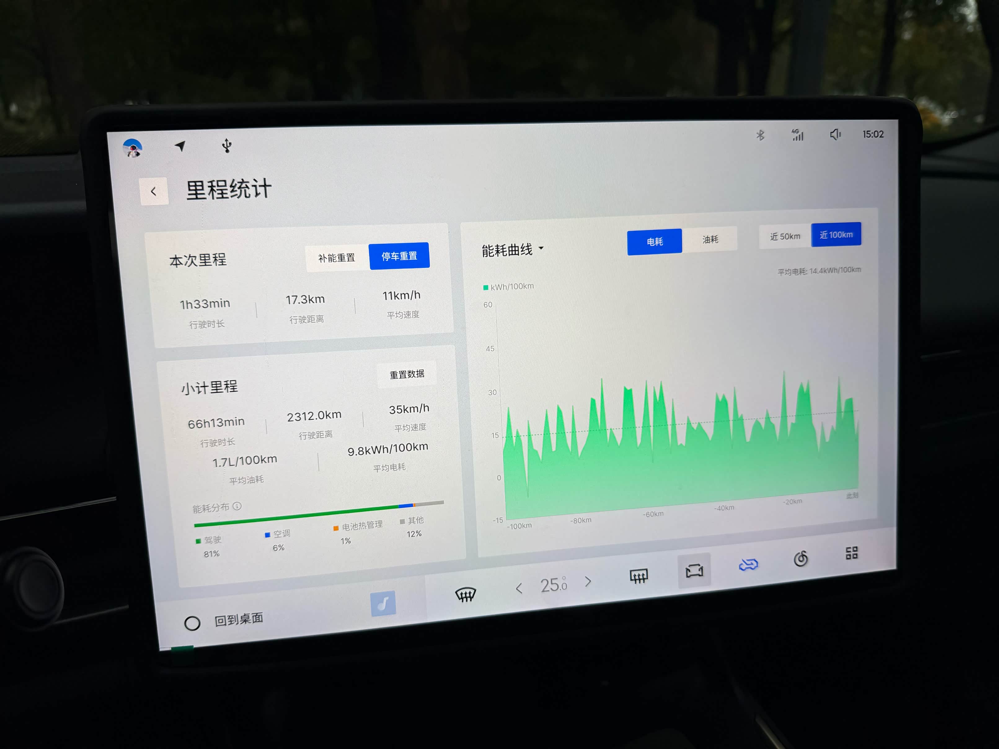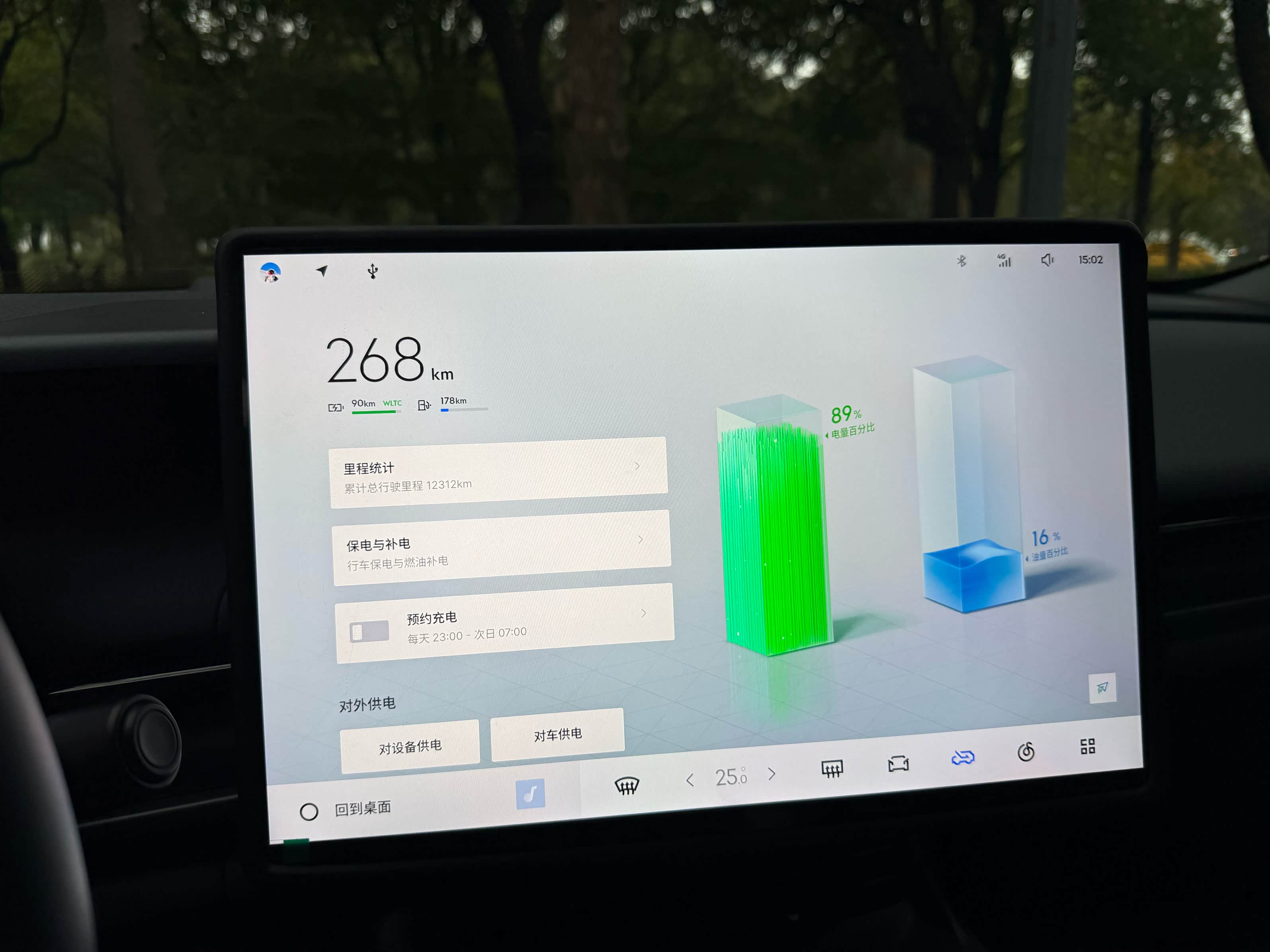 电耗油耗也很满意~😎平均电耗夏天开空调 16 左右,春秋 12-15,黄金右脚开过 11,冬天 20 左右。快充补能大概 40 分钟,送的家充大概要 2-3 小时。充一次纯电能跑 100 公里,周边短途游没有里程焦虑。60升大油箱,跑远路加满可以跑来回。