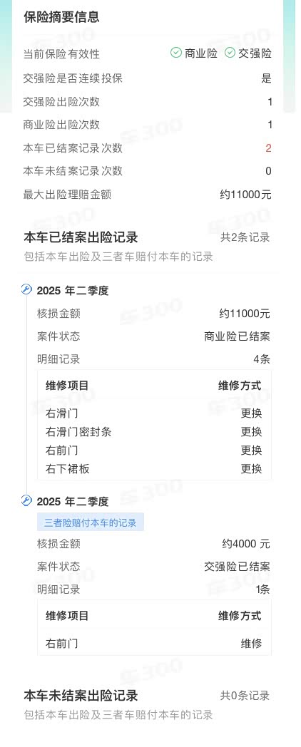 出险记录的2条核损是交强险+商业险的预估拆分记录,并非实际赔付两笔,只要4S店维修发票金额=保险公司实际赔付金额=11000元,就是正常流程,无需担心被骗保或车辆有额外记录问题。