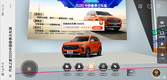打开APP之后,点击云车展,有好几款畅销车型。有品牌专区。我们找到上汽MAXUS。有四款车在列表里。
