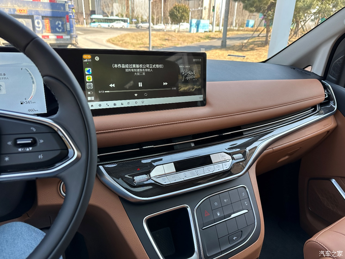 双辐平底式方向盘是皮质包裹的,握感特别充实,上面还有多功能按键,可以控制多媒体和定速巡航。前面是双12.3英寸的全液晶仪表和悬浮屏组合,科技感直接拉满。卡片式的UI界面很简洁,有360全景影像和车载蓝牙这些基本功能。贯穿式空调出风口下面,有自动空调系统的拨轮和物理按键面板,日常操作特别方便。