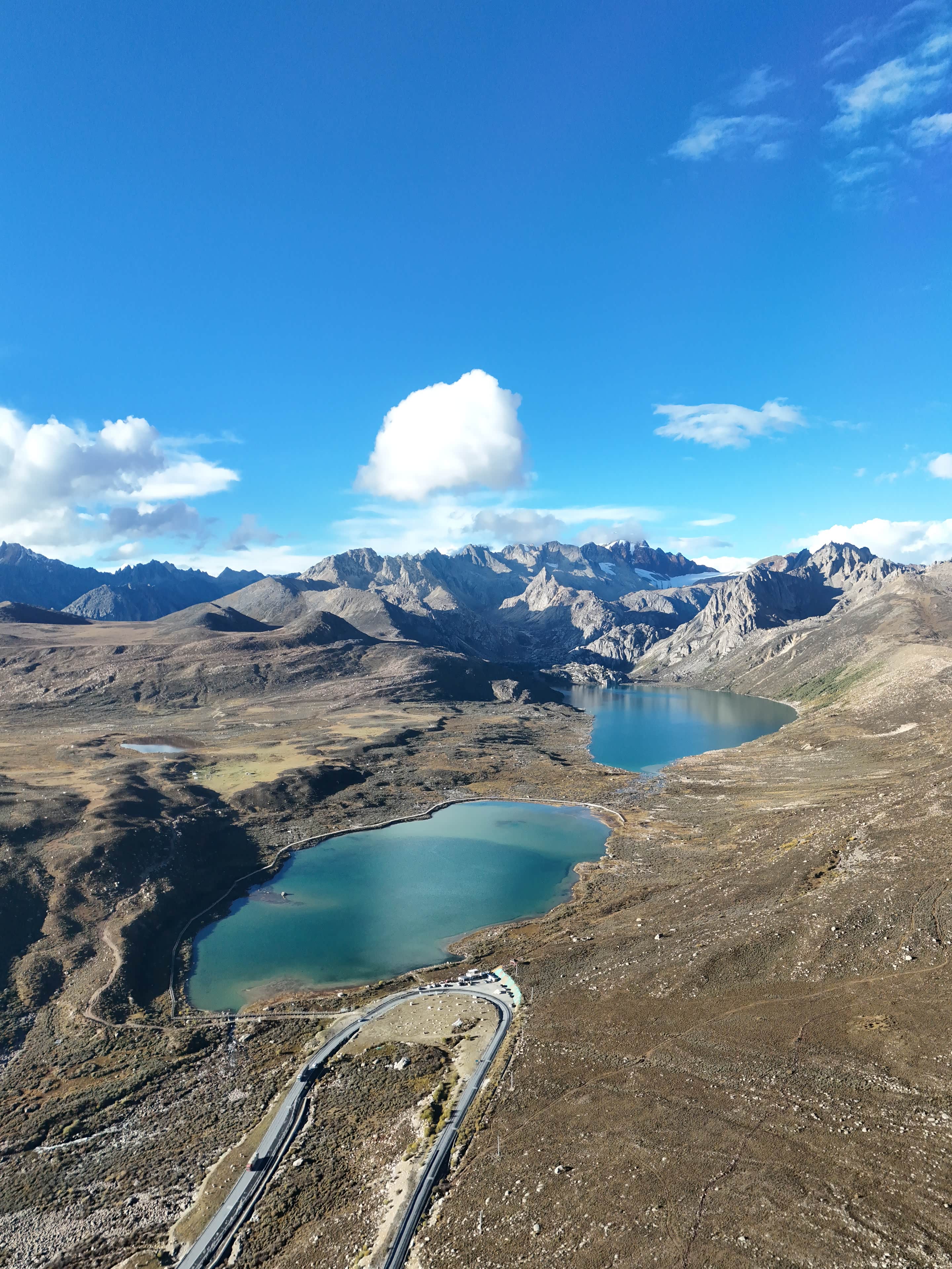 然后经过了姊妹湖,这个地方非常漂亮,天气也非常好,蓝天白云,拍照完全不用加滤镜。两个湖的水非常碧绿,就仿佛是两颗绿宝石镶嵌在大地,远处还有一座雪山,拍照非常出片。拍完我们又马不停蹄的赶路程了。