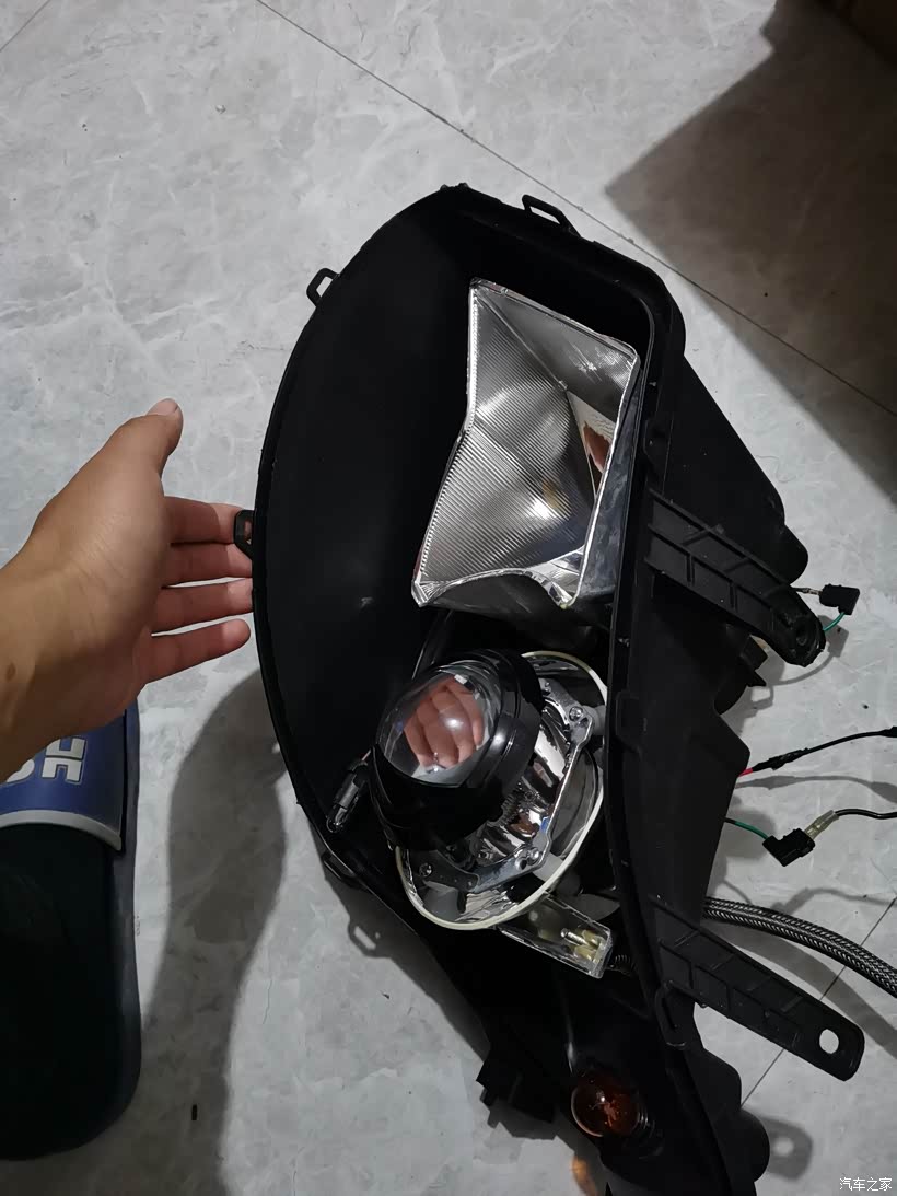 车灯不是原装的是买的百十块钱的回来直接用手就扒开了灯壳,原车灯放家里备用年审。全程自己动手也不是很复杂,买了一个开孔器借了个手电钻。