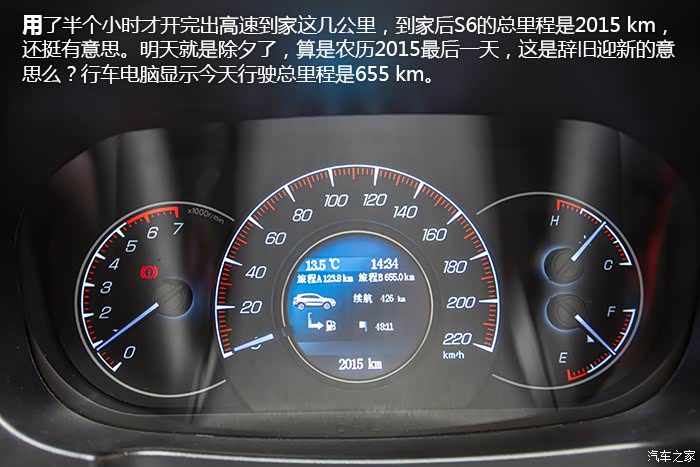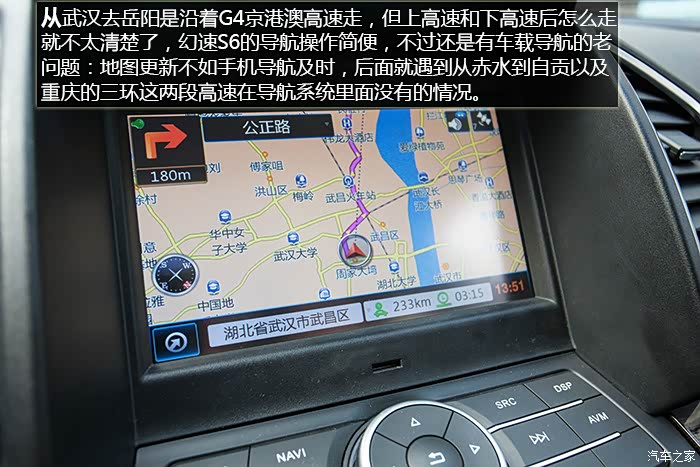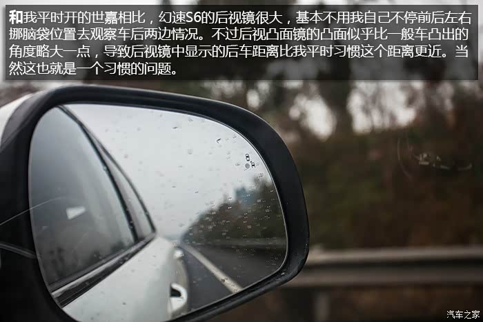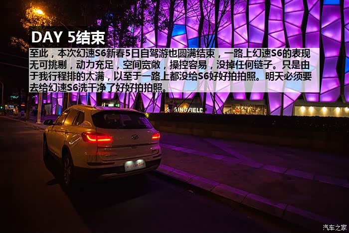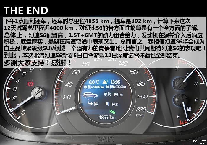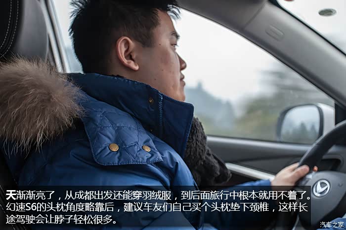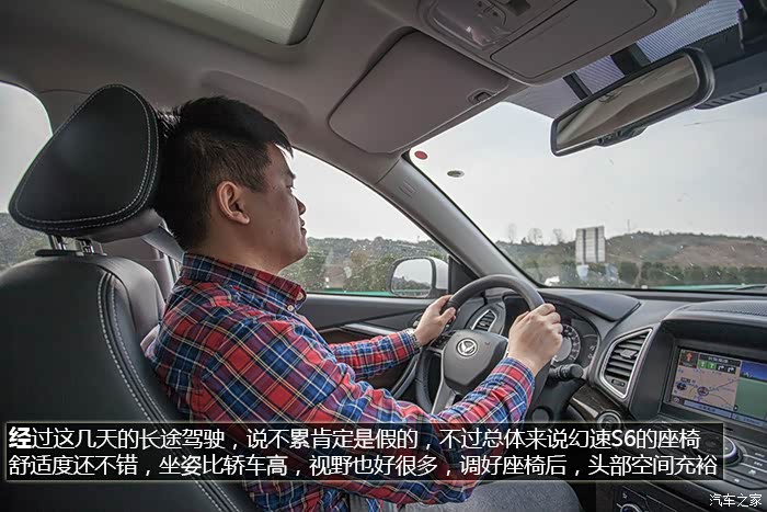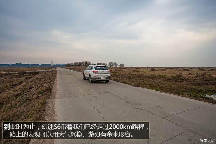 12天试驾总行驶里程(包括取车、还车)将近 4000 km,其中路况包括高速、国道、城市拥堵路段,S6全程表现无可挑剔,未出现任何问题,1.5T+6MT的动力组合在涡轮介入后动力表现优秀,0至60 km/h加速轻快从容,中后段加速亦信心十足,说轻松到120 km/h一点不为过,如果非要挑缺点的话,可能就是在1挡起步,涡轮介入前动力略有迟滞,在进凤凰县城堵车二小时过程中,有几段角度略大的上坡路段,因为拥堵,需不断坡道起步,刚开始抬离合给油轻了造成熄火一次,后来摸清S6的习惯后,坡道上半离合给油到2000转就没完全没问题了。另外时速上到120 km/h后风噪略大,但完全属于可接受范围。除了加速表现不错之外,高速行车中另外一个深刻体会就是幻速S6这套底盘以及配备的前麦弗逊式+后多连杆独立悬架系统在高速弯道中的表现,大大超出了我的预期,底盘给人感觉很整且厚实,悬架对车身的支撑充足,高速过弯悬架支撑十分到位,给驾驶者很强信心,并不会给人SUV车身高、重心高,过弯需要比轿车更低速度的感觉。而在高速上的拥堵路段,幻速S6更高的视野也让长期开轿车的我感觉压迫感不那么强。自驾在重庆、贵州山区高速路段,深刻体会了自动大灯的好处,隧道太多,省去了频繁开关大灯的麻烦。而电子助力转向让方向盘转向轻盈,开习惯S6后,再开我自己机械转向的车,有方向转不动的感觉。