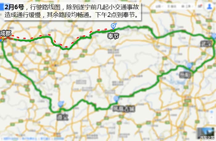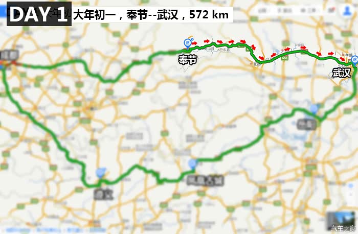 这次春节试驾包含了回家过年和5日自驾游两部分,说是一次说走就走的旅程也不为过,因为之前一直计划的是父母亲来成都过年,我也一直是计划带他们去成都周边的景点看看,不过临到了大年27父亲电话说胃病犯了,为防止旅途中的折腾加重病情,还是不到成都了。我一寻思去年春节也没和父母团聚,今年无论如何也得在一起过年,于是当下决定大年28自己开车回重庆奉节老家,大年29(除夕)在家陪陪父母,初一开启我和LD的2016新春第一次自驾之旅。和LD一商量,LD也同意我的想法,问去哪儿?LD说还没去过武汉,要不去看看?刚好LD舅舅在武汉。OK,那就去武汉。本着不走回头路的原则,大年27晚上连夜制定出行路线规划,看酒店、住宿、路线及景点信息,最后弄到晚上2点在百度上画了下面这张路线图,这个时候的实时地图显示成南高速已经是红色了...希望明早出发不要堵。