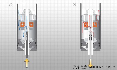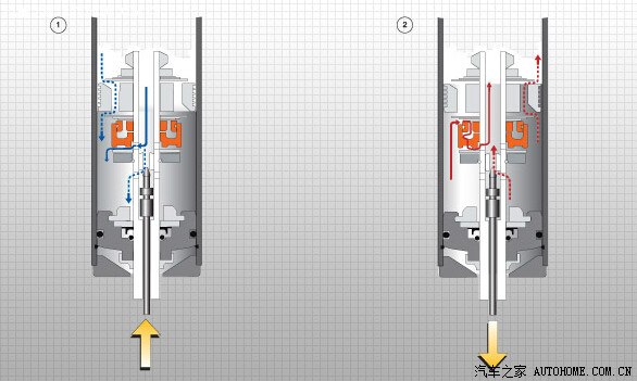 上面图中左右分别表示避震在压缩和回弹过程中,避震筒内的油的流动方式,左右一样,靠上的虚线箭头表示在液体低俗运动下的流动路线,下面的虚线箭头表示在较高速度下的流动路线,而在超高速的流动情况下,油能够直接通过中间橘黄色的也就是所谓的DFV阀体直接通过,并且压缩和回弹时的流动路线不同。所以,通过这三种不同的流通方式,能够是得避震有更加迅速的反应,使车辆能够永远轮胎和地面的接触。
