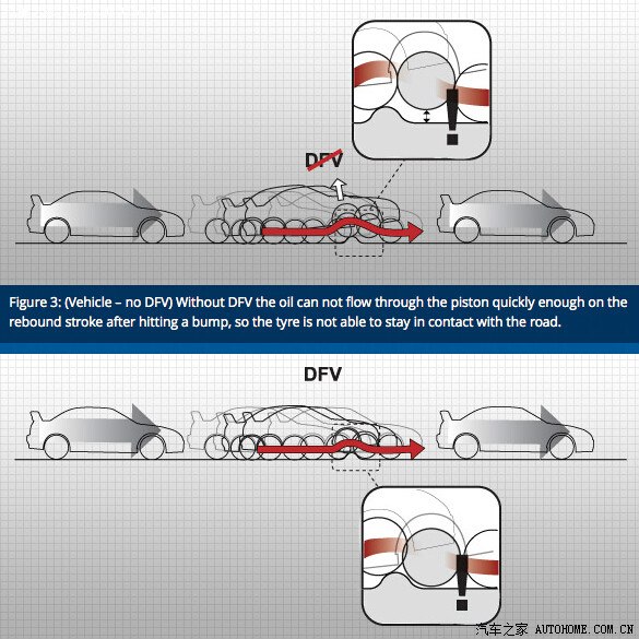 这张图就能够很直观的看出来,有无DFV的区别。我已经亲身体验到了这种区别,就拿最平常的过减速带来说吧,同样的速度,原厂避震,尤其是后避震在通过后感觉屁股是弹起来的。而我换完避震后,过减速带是直接顺着减速带就下去了,就好像下面有个东西把车吸下去了!