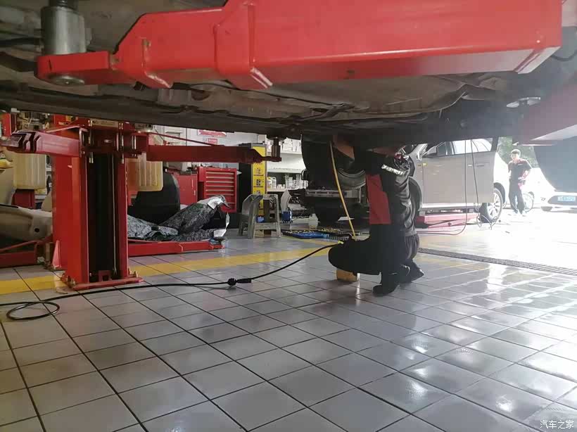 师傅在放机油和检查底盘。