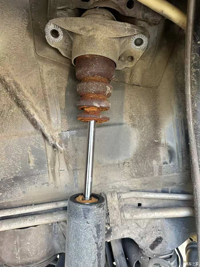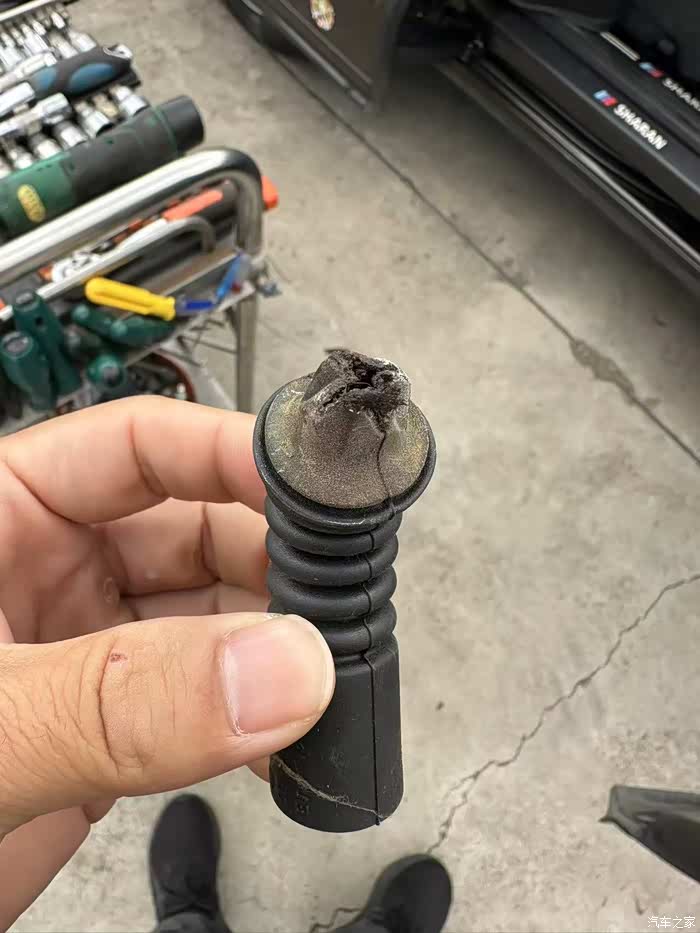 出了门感觉不对劲,再加上正好有时间,就问了下一个专修夏朗的,正好他今天也有空。于是立马驱车过去。检查了下发现前摆臂胶套坏了,后避震胶块也裂了,拆后胶块的时候发现出水口堵了也顺便换了,正好导航屏幕偶尔失灵,想着来都来了一起弄了。