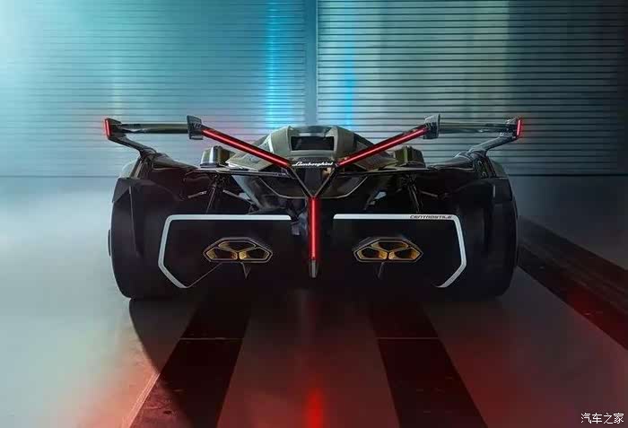 车身尾部,Lambo V12 Vision GT的设计绝对可以称得上简洁,除了那十分唬人的6个排气管外,尾灯组也与后尾翼融为了一体,Y字型的设计也与日间行车灯进行了呼应。