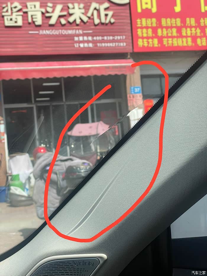 到了3号早上一出门被这前档吓了一跳,右边玻璃很长一条凹坑,阳光都被折射了。
