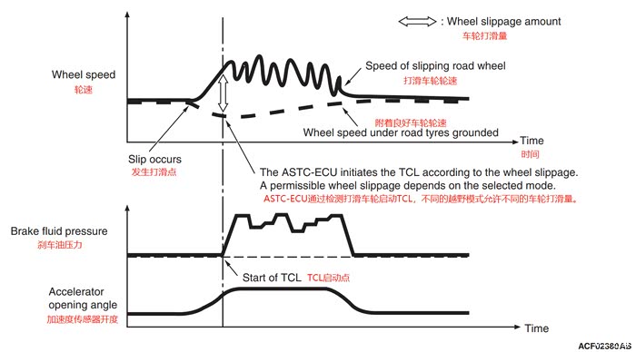 车轮打滑、加速度传感器开度满足一定值以后,ASTC-ECU就会启动TCL,这个时间点就是TCL启动点。它启动后会给打滑车轮的刹车分泵施加油压(中间的曲线),此时打话车轮的转速就会像第条曲线那样呈波浪状。