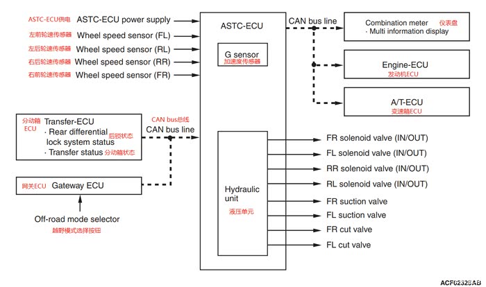 通过上图可以看出来整个系统核心控制部件是ASTC-ECU,它通过监测各个车轮轮速来控制各个刹车分泵的油压,并且协同发动机、变速箱工作,具体工作原理下面详解。