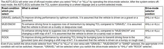 1、4HLc挡位下有碎石模式(GRAVEL)、泥地/雪地模式(MUD/SNOW)、沙地模式(SAND)三种模式可以使用。