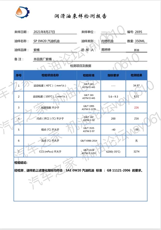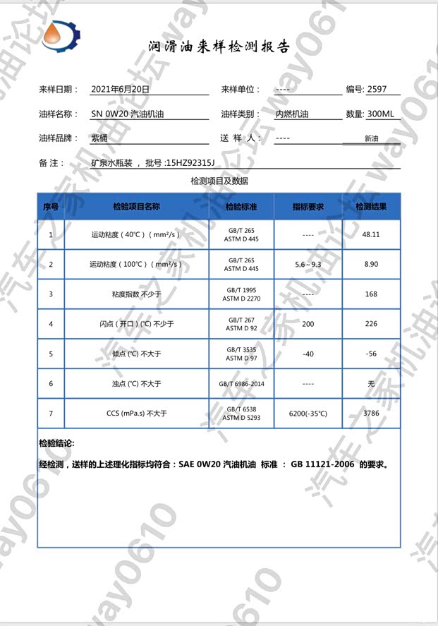 检测只对样品负责,样品由车友“蒋婷婷”提供,矿泉水瓶装,来自4S店。
