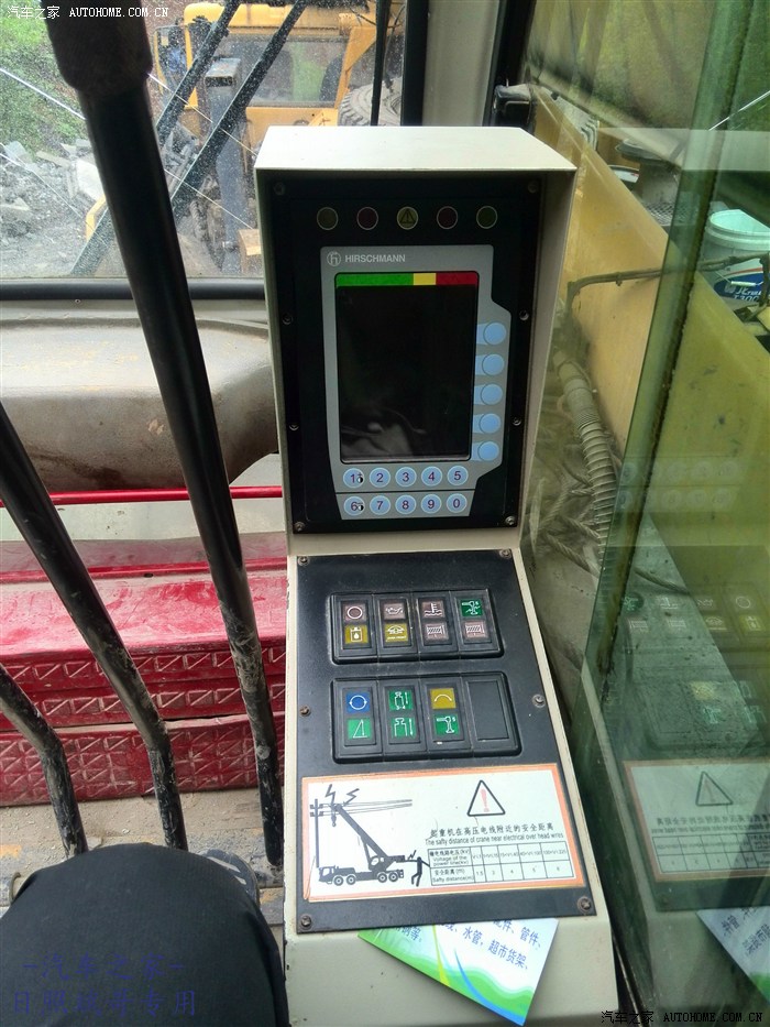 这是吊车的电脑,和警示灯,电脑上显示大臂的高度、长度,和钩吊的水平距离。还有此角度、大臂的长度,最大吊起多重的物品,还有物品的重量,如果物品超重会有警告音和灯的。