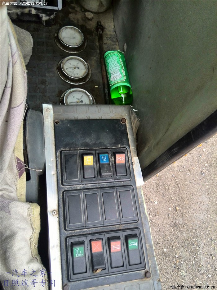 这是支腿的五个开关,分别是什么呢,下图上说明。里面还有两个水平表,看车的左右、前后的水平如何。全是泥巴,水平尺大家都见过。还有用圆的,里面是水准泡的。目的就是为了把车支水平了,别翻了。